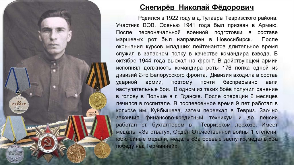 Снегирёв Николай ФёдоровичРодился в 1922 году в д.Тулавры Тевризского района.