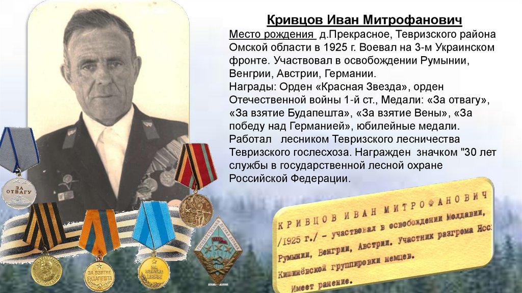 Кривцов Иван МитрофановичМесто рождения д.Прекрасное, Тевризского района