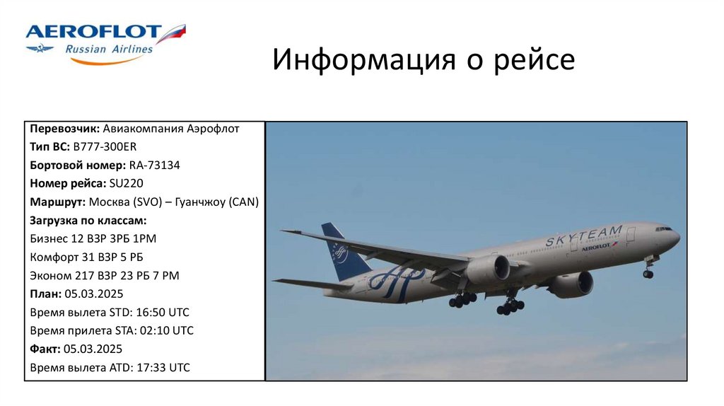 Информация о рейсеПеревозчик: Авиакомпания Аэрофлот