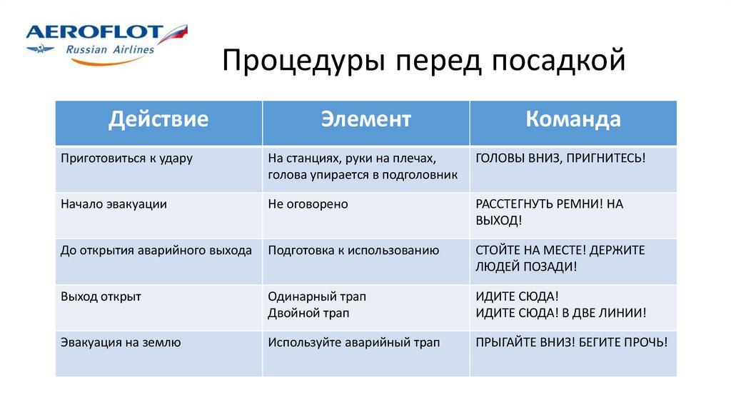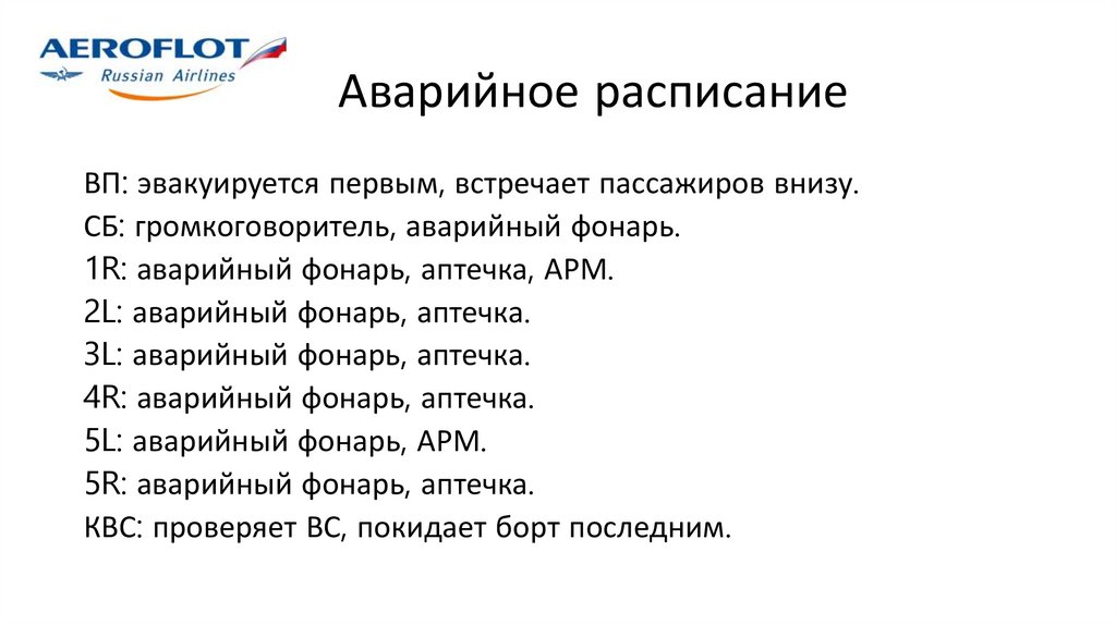Аварийное расписаниеВП: эвакуируется первым, встречает пассажиров внизу.