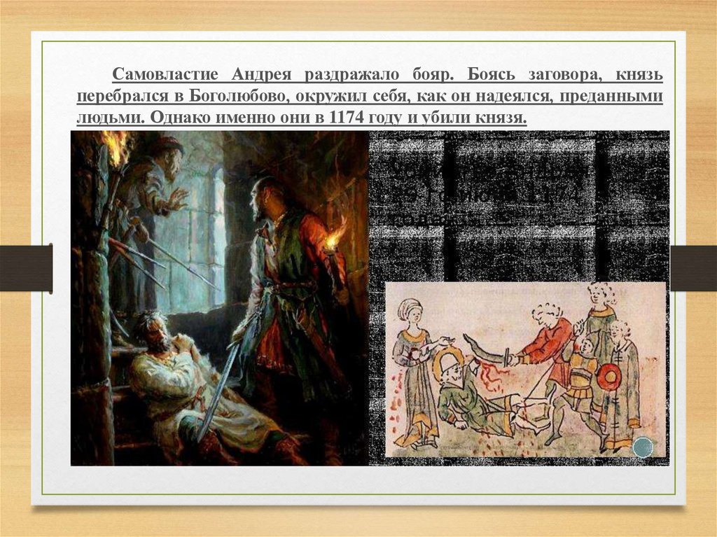 Самовластие Андрея раздражало бояр. Боясь заговора, князьперебрался в Боголюбово, окружил себя, как он надеялся, преданными