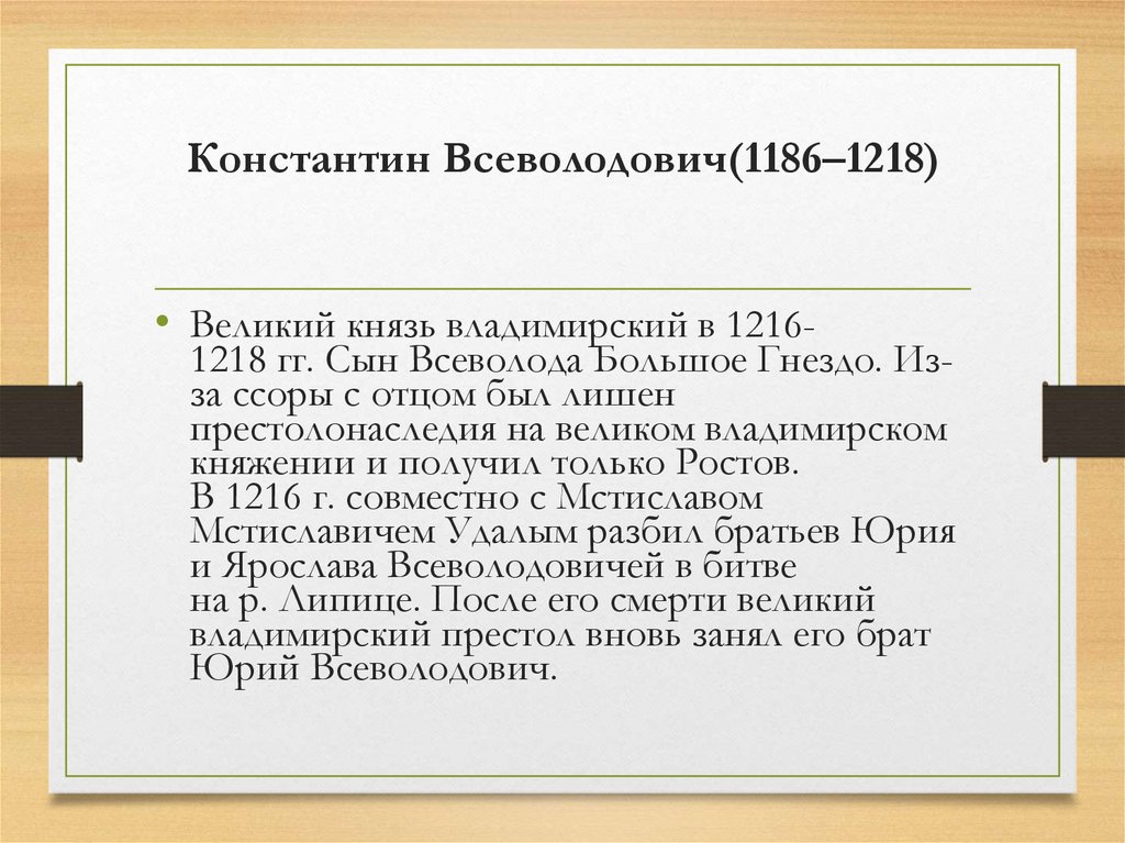 Константин Всеволодович(1186–1218)• Великий князь владимирский в 1216-