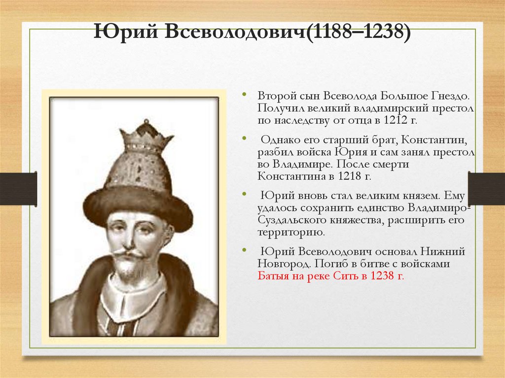 Юрий Всеволодович(1188–1238)• Второй сын Всеволода Большое Гнездо.