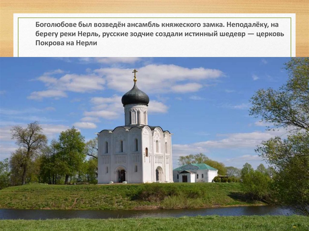 Боголюбове был возведён ансамбль княжеского замка. Неподалёку, наберегу реки Нерль, русские зодчие создали истинный шедевр — церковь