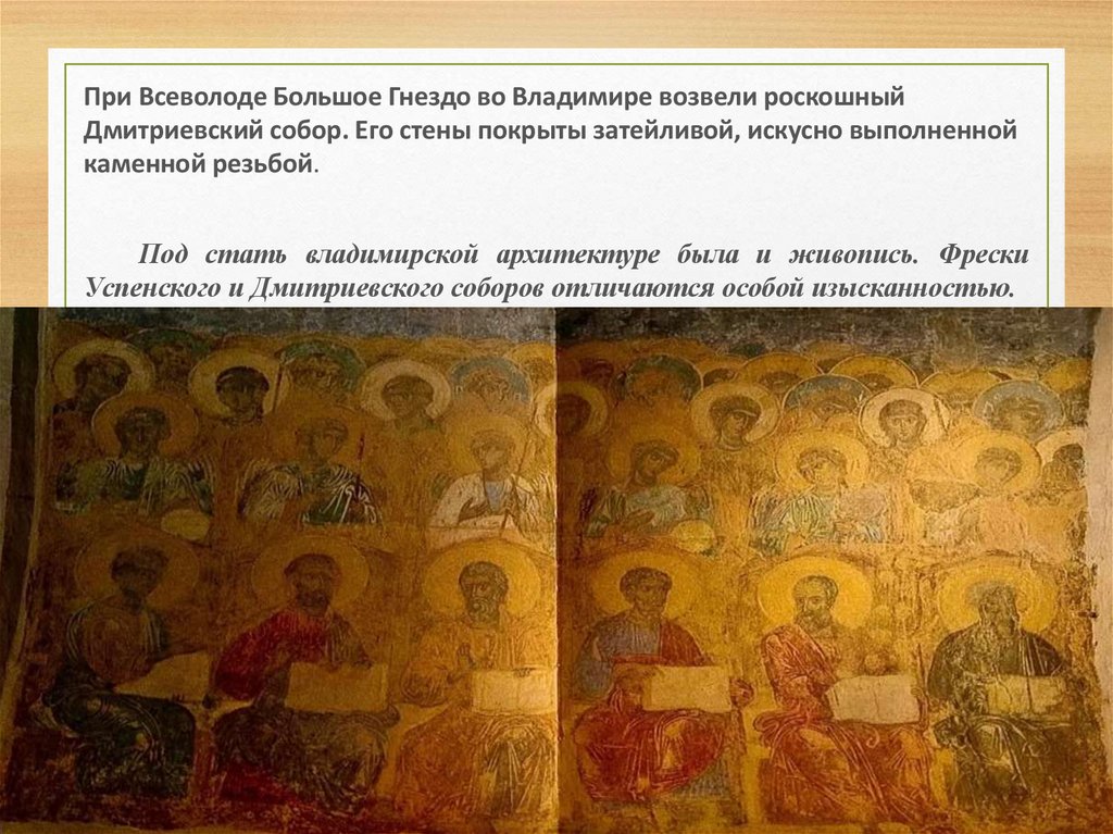 При Всеволоде Большое Гнездо во Владимире возвели роскошныйДмитриевский собор. Его стены покрыты затейливой, искусно выполненной