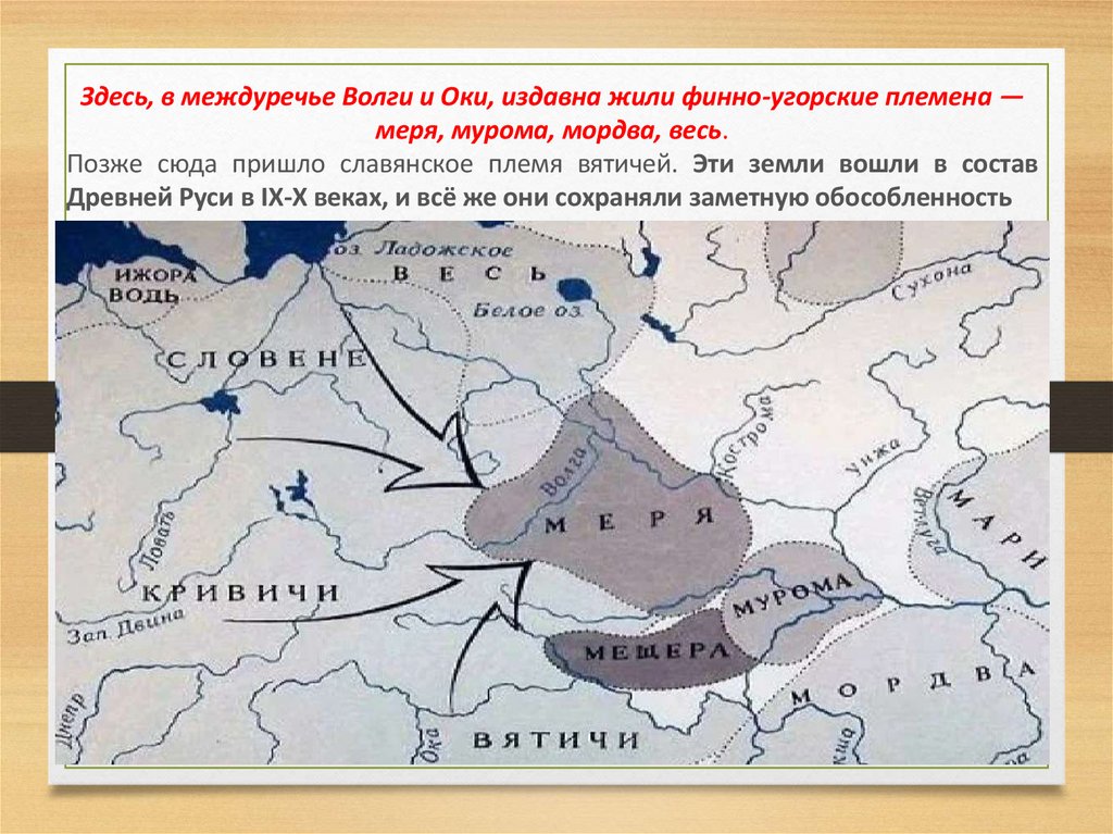 Здесь, в междуречье Волги и Оки, издавна жили финно-угорские племена —меря, мурома, мордва, весь.