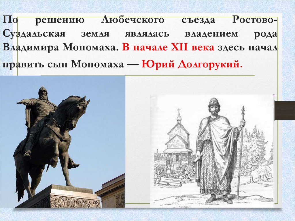 По решению Любечского съезда РостовоСуздальская земля являлась владением родаВладимира Мономаха. В начале XII века здесь начал