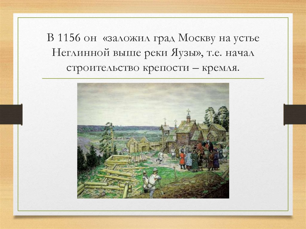 В 1156 он «заложил град Москву на устьеНеглинной выше реки Яузы», т.е. начал