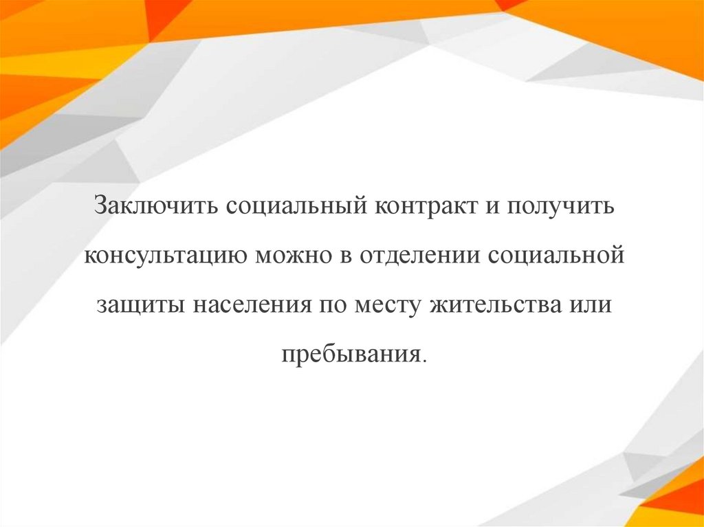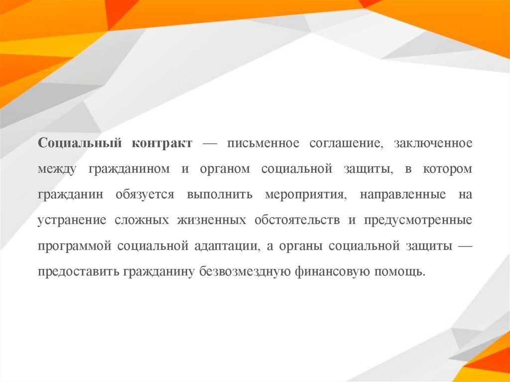 Социальный контракт — письменное соглашение, заключенноемежду гражданином и органом социальной защиты, в котором