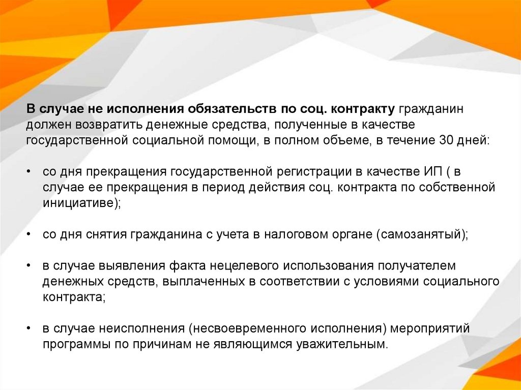 В случае не исполнения обязательств по соц. контракту гражданиндолжен возвратить денежные средства, полученные в качестве