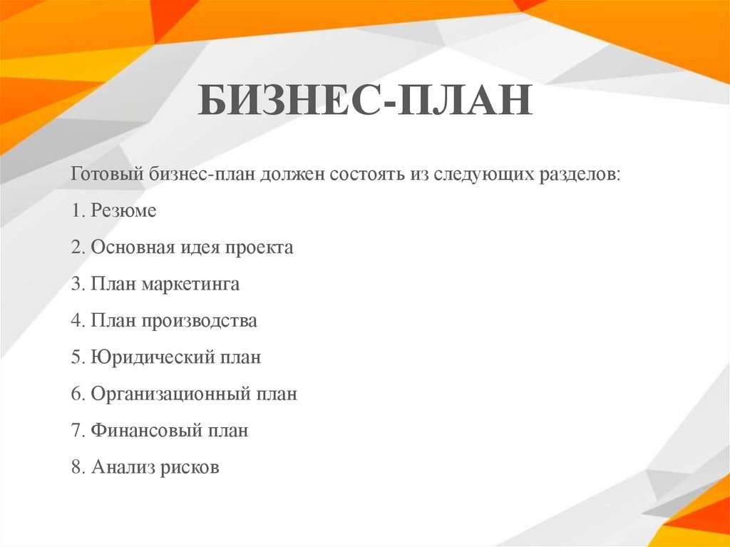 БИЗНЕС-ПЛАНГотовый бизнес-план должен состоять из следующих разделов: