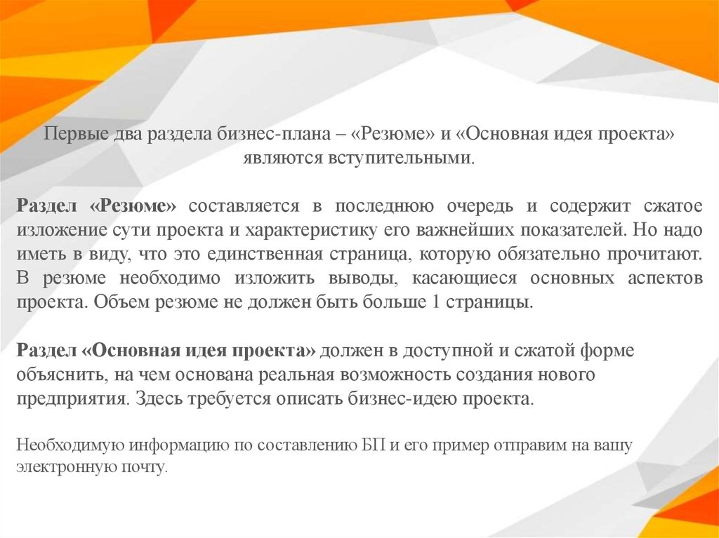 Первые два раздела бизнес-плана – «Резюме» и «Основная идея проекта»являются вступительными.