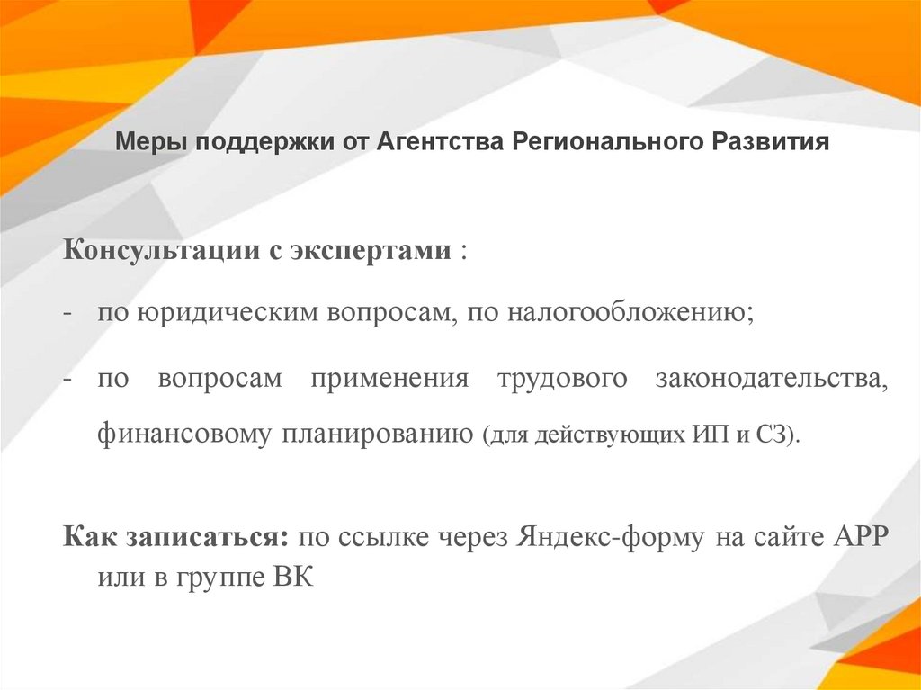 Меры поддержки от Агентства Регионального РазвитияКонсультации с экспертами :