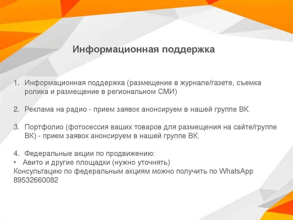 Информационная поддержка1. Информационная поддержка (размещение в журнале/газете, съемка