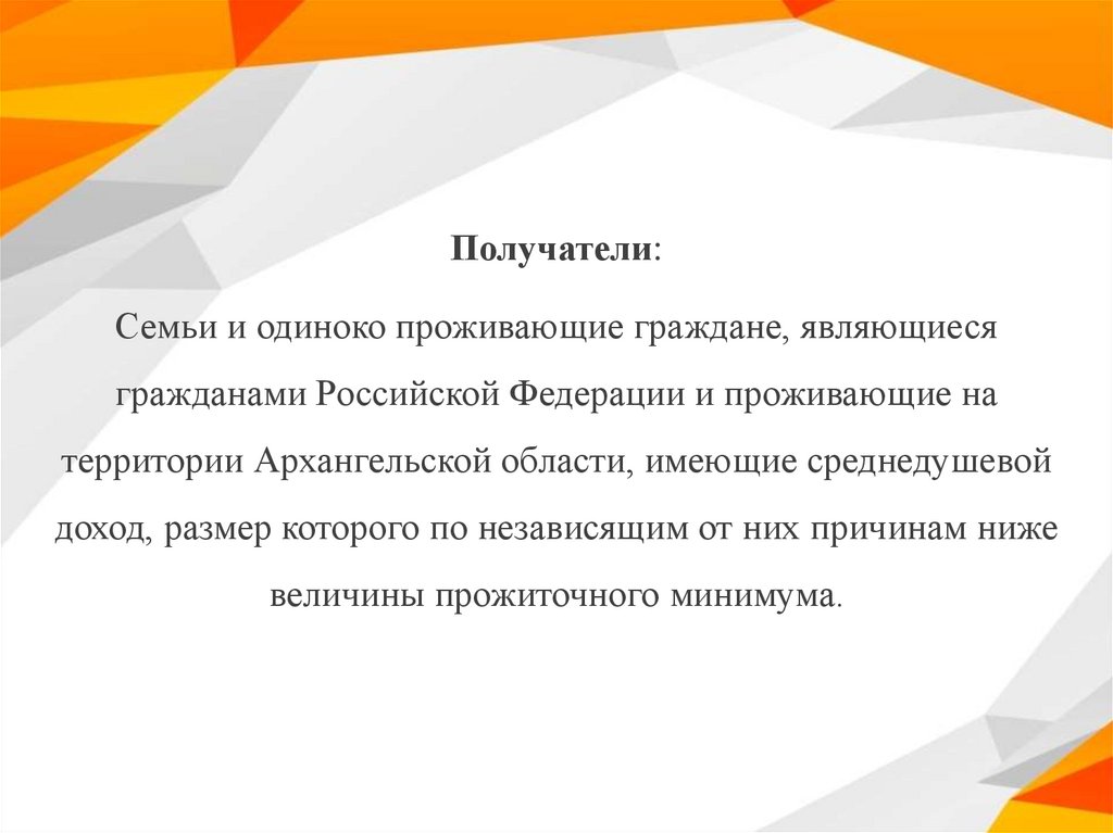 Получатели:Семьи и одиноко проживающие граждане, являющиеся
