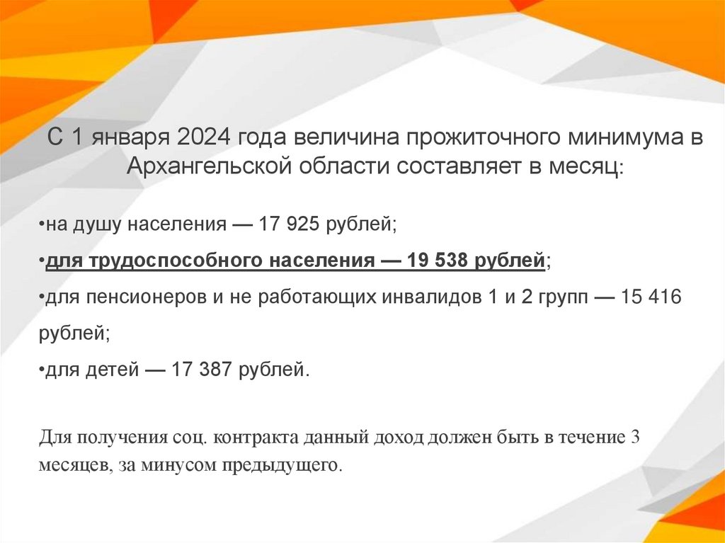 С 1 января 2024 года величина прожиточного минимума вАрхангельской области составляет в месяц: