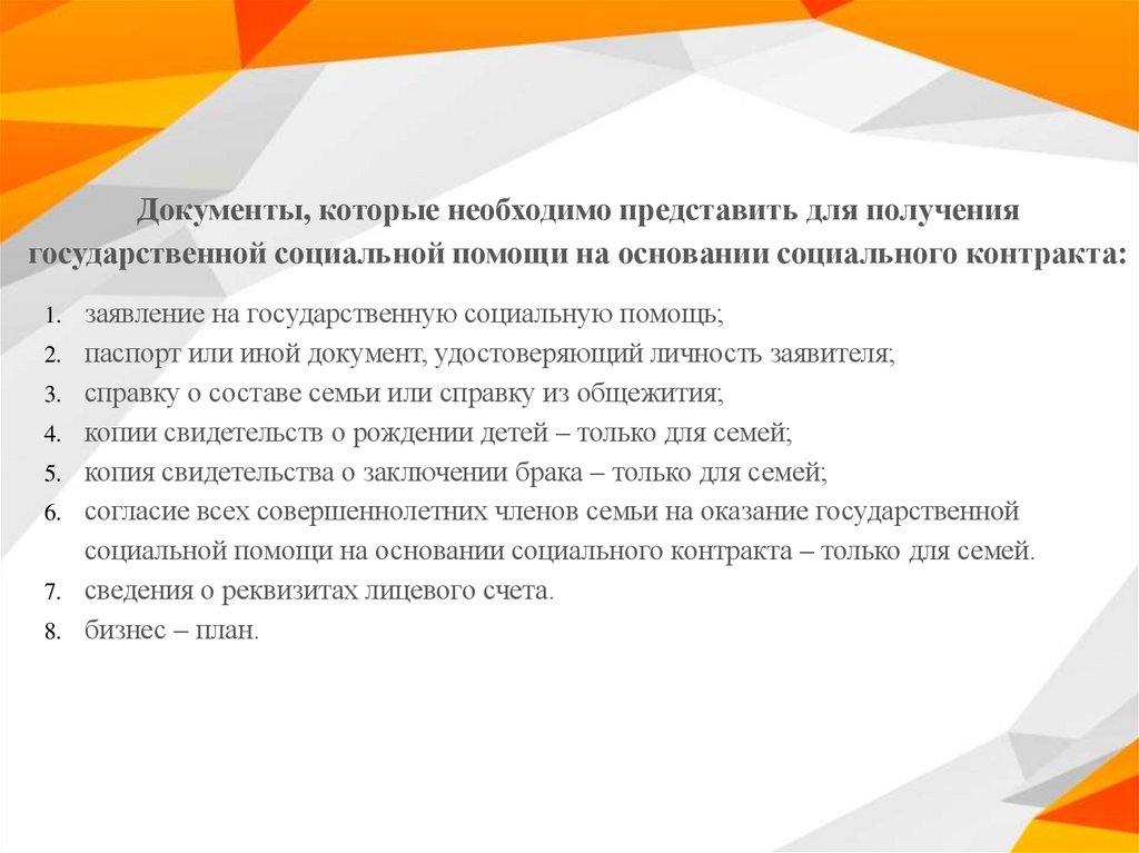 Документы, которые необходимо представить для получениягосударственной социальной помощи на основании социального контракта:
