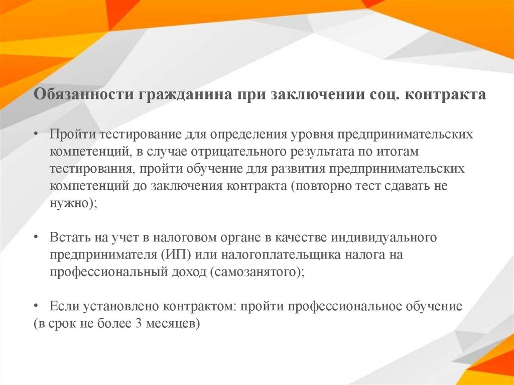 Обязанности гражданина при заключении соц. контракта• Пройти тестирование для определения уровня предпринимательских