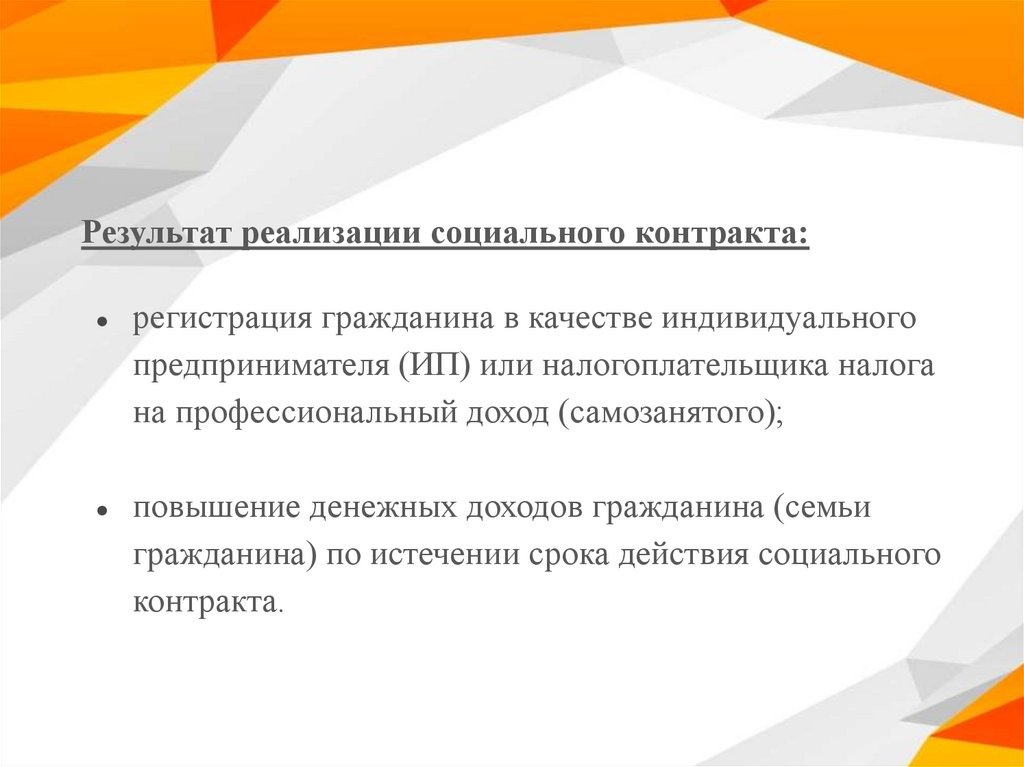 Результат реализации социального контракта:регистрация гражданина в качестве индивидуального