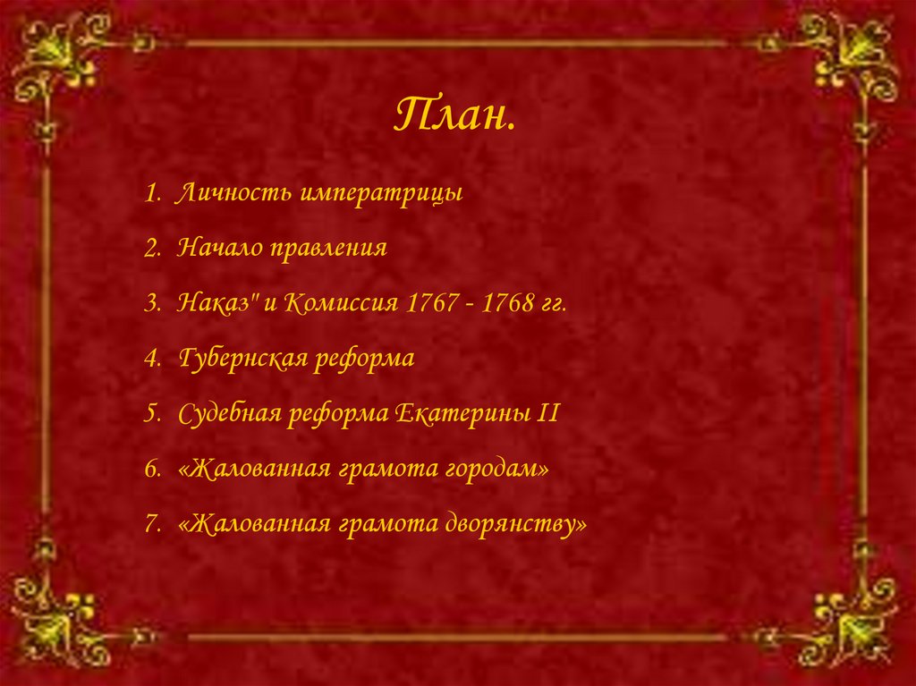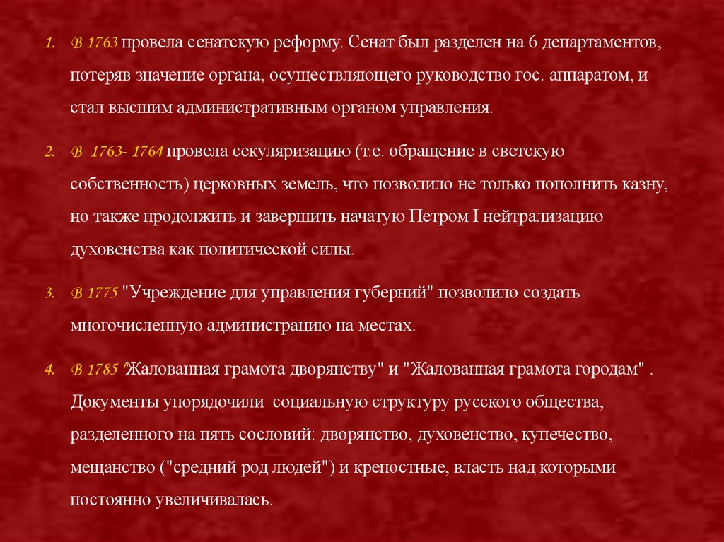 1. В 1763 провела сенатскую реформу. Сенат был разделен на 6 департаментов,потеряв значение органа, осуществляющего руководство гос. аппаратом, и