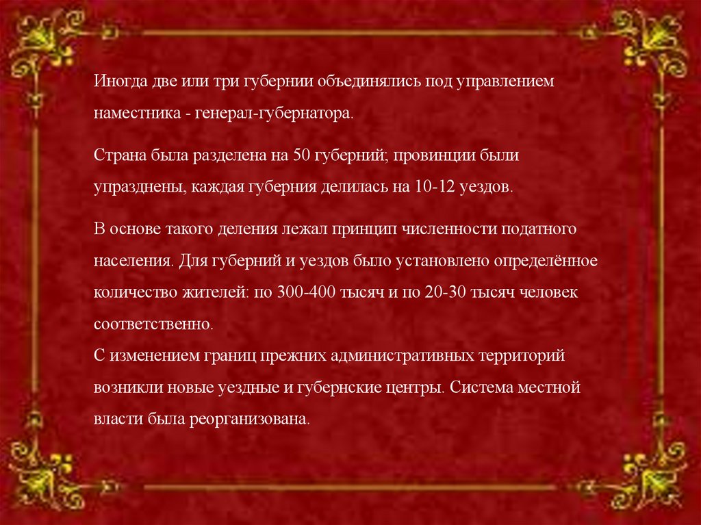 упразднены, каждая губерния делилась на 10-12 уездов.