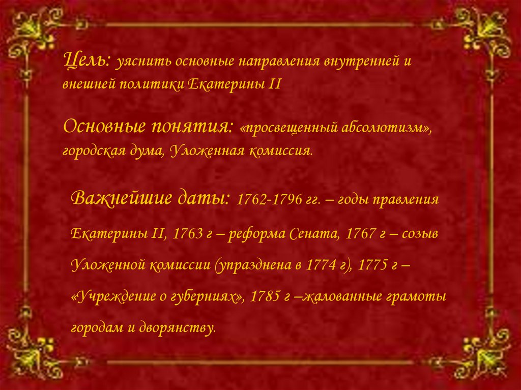 Цель: уяснить основные направления внутренней ивнешней политики Екатерины II