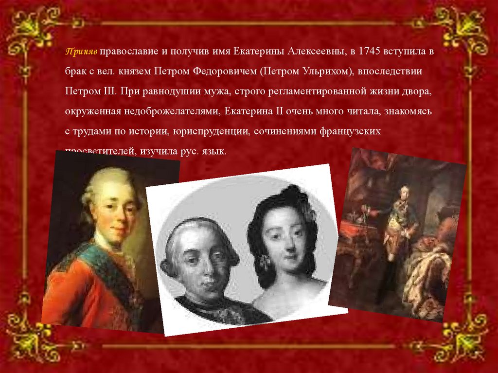 Приняв православие и получив имя Екатерины Алексеевны, в 1745 вступила вбрак с вел. князем Петром Федоровичем (Петром Ульрихом), впоследствии