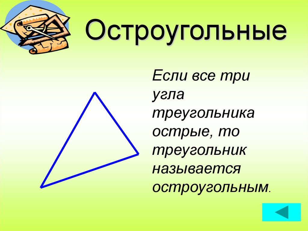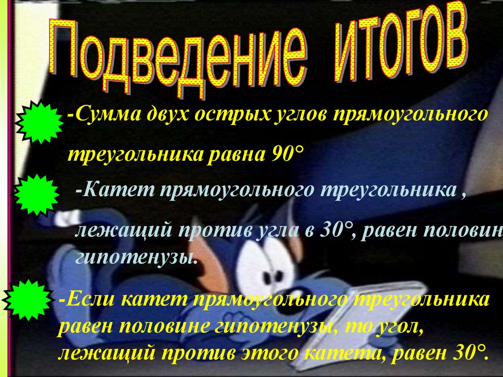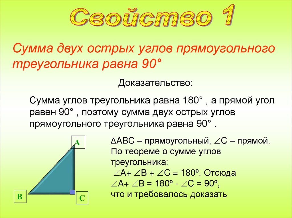 -Сумма двух острых углов прямоугольноготреугольника равна 90°