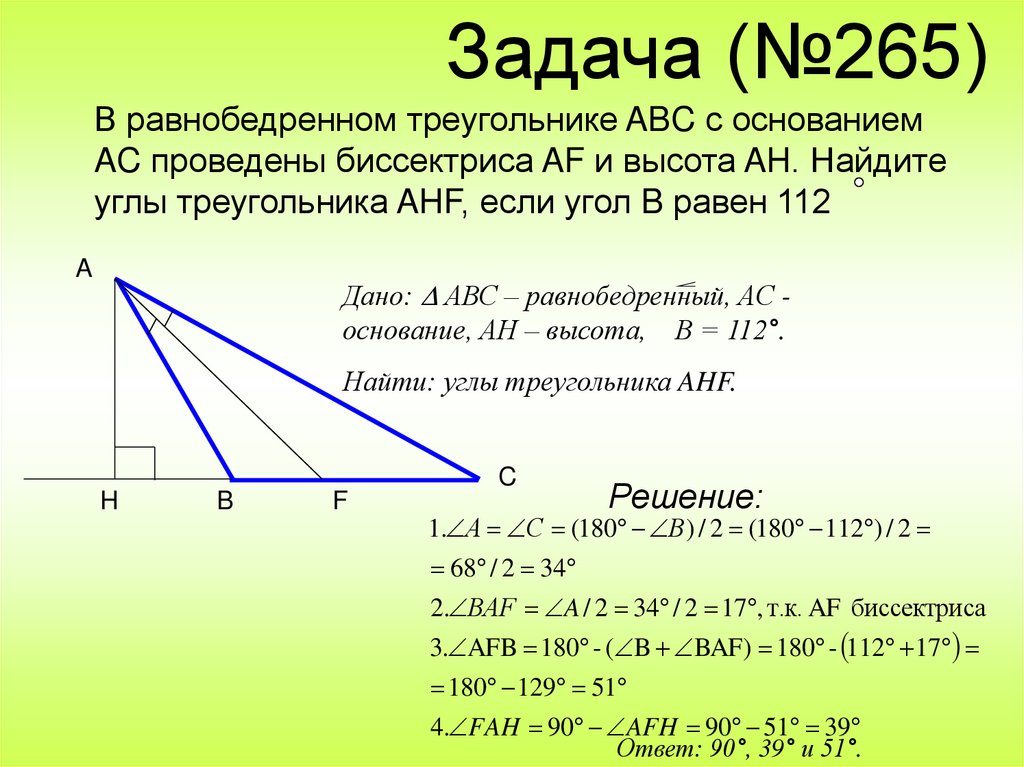 Задача (№265)В равнобедренном треугольнике ABC с основанием