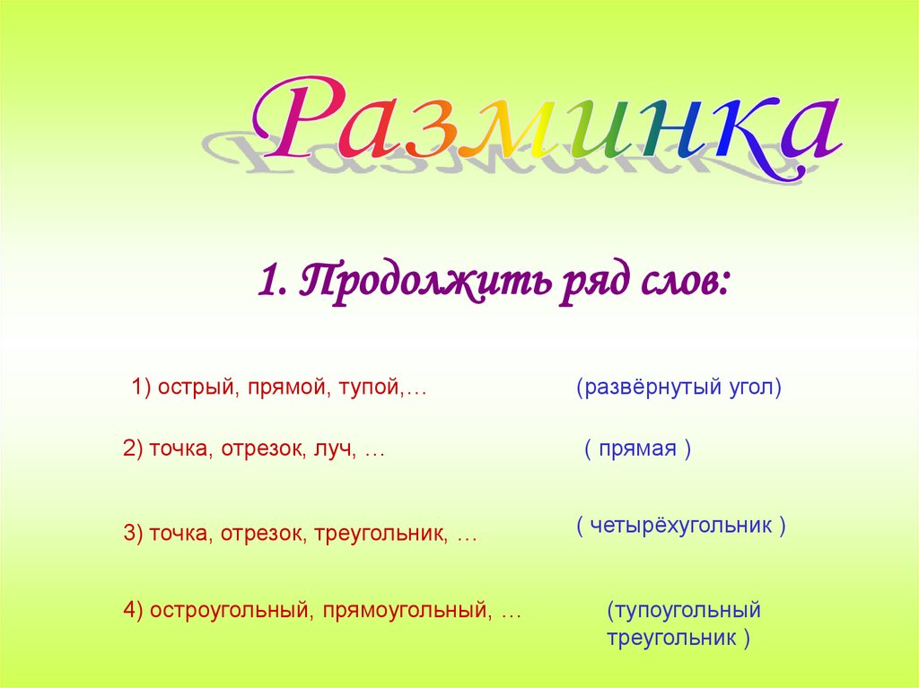 1. Продолжить ряд слов:1) острый, прямой, тупой,…