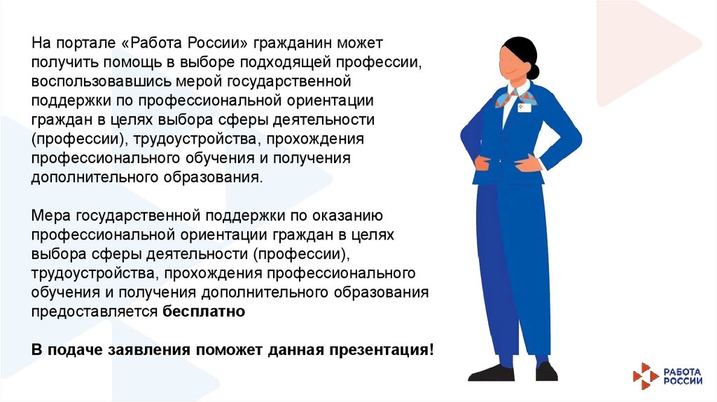 На портале «Работа России» гражданин можетполучить помощь в выборе подходящей профессии,