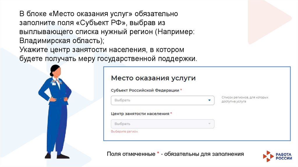 В блоке «Место оказания услуг» обязательнозаполните поля «Субъект РФ», выбрав из