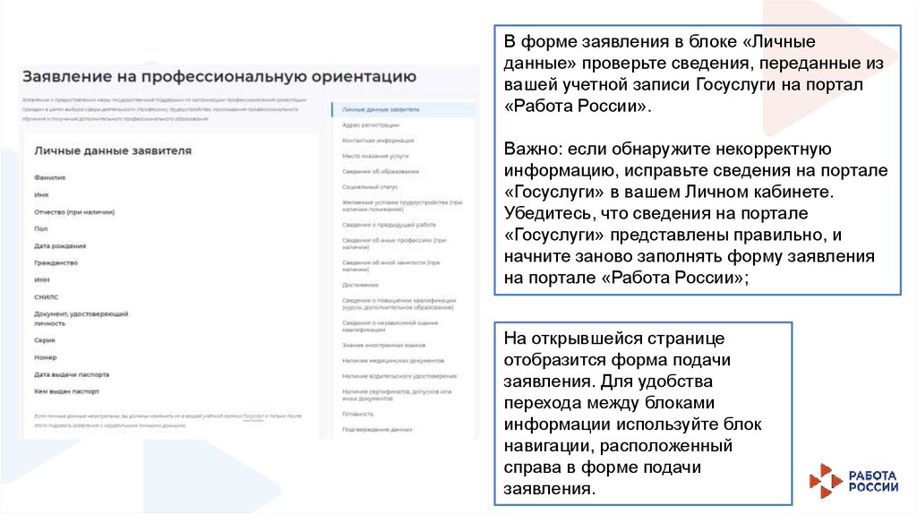 В форме заявления в блоке «Личныеданные» проверьте сведения, переданные из