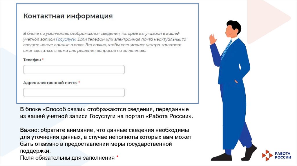 В блоке «Способ связи» отображаются сведения, переданныеиз вашей учетной записи Госуслуги на портал «Работа России».