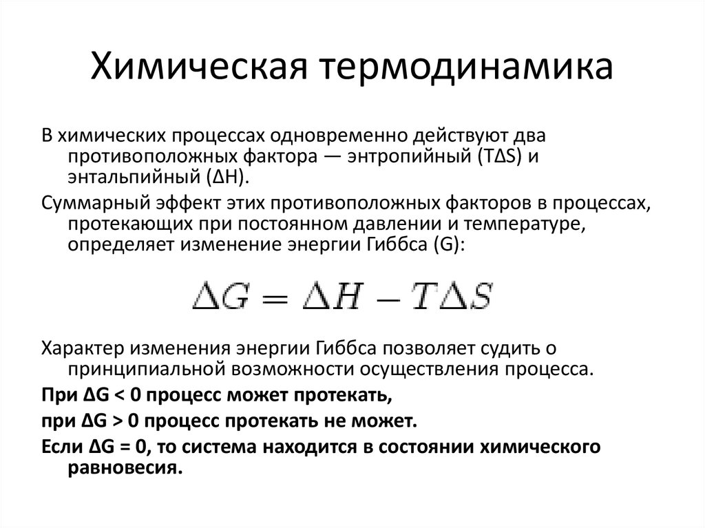В химических процессах одновременно действуют двапротивоположных фактора — энтропийный (TΔS) и
