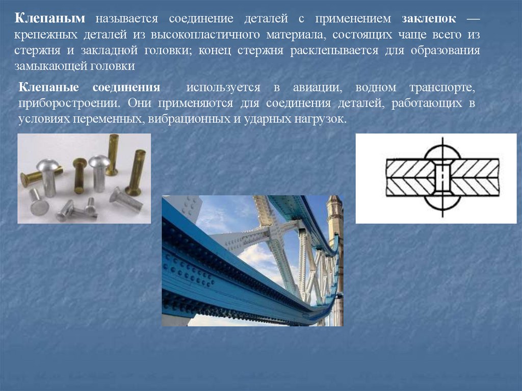 Клепаным называется соединение деталей с применением заклепок —крепежных деталей из высокопластичного материала, состоящих чаще всего из
