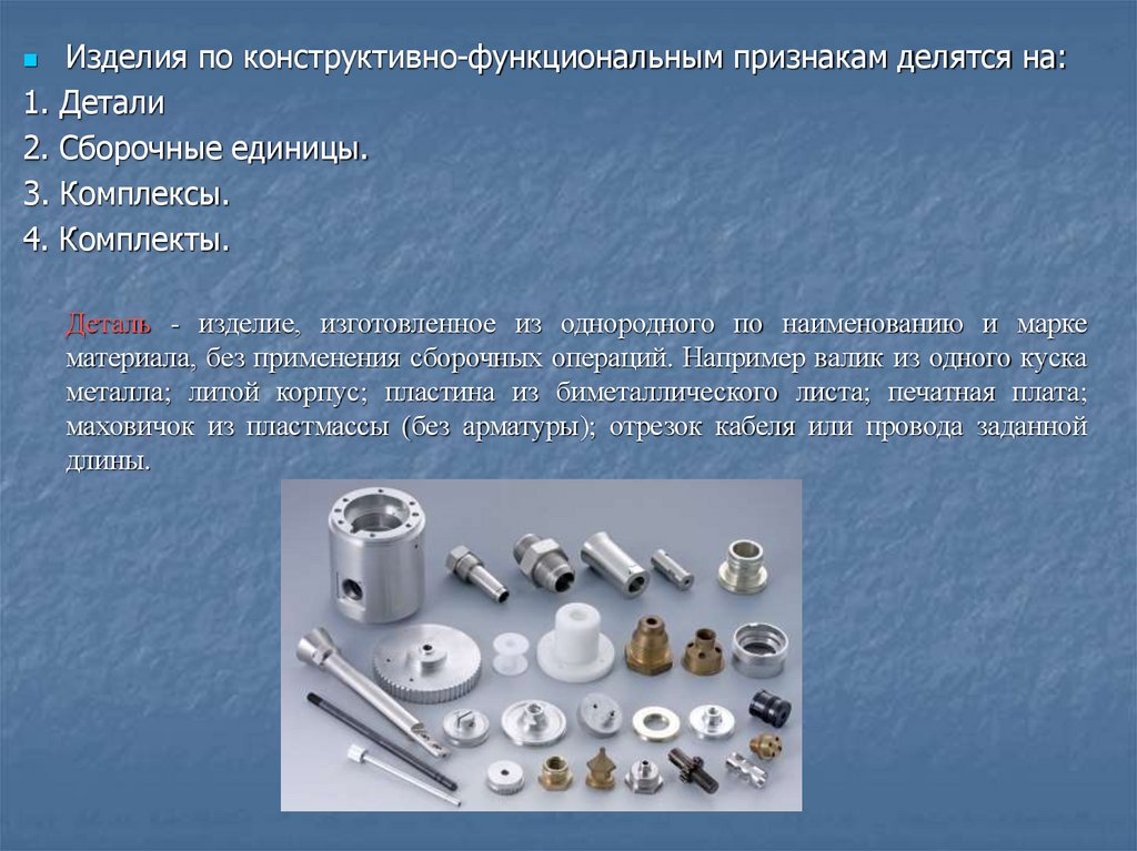 Изделия по конструктивно-функциональным признакам делятся на:1. Детали
