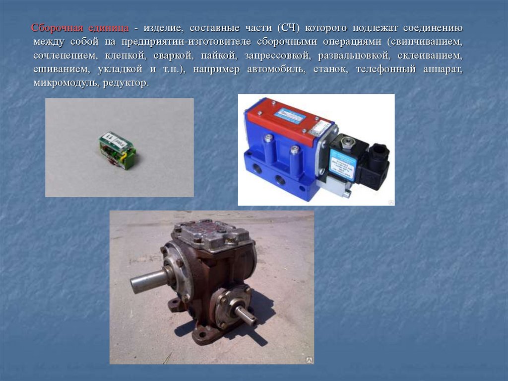 Сборочная единица - изделие, составные части (СЧ) которого подлежат соединениюмежду собой на предприятии-изготовителе сборочными операциями (свинчиванием,