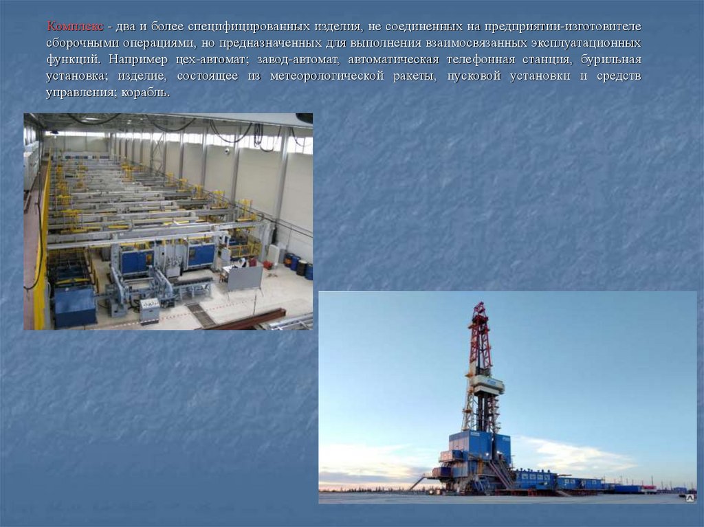Комплекс - два и более специфицированных изделия, не соединенных на предприятии-изготовителесборочными операциями, но предназначенных для выполнения взаимосвязанных эксплуатационных