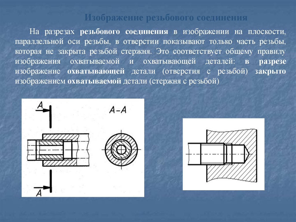 Изображение резьбового соединенияНа разрезах резьбового соединения в изображении на плоскости,