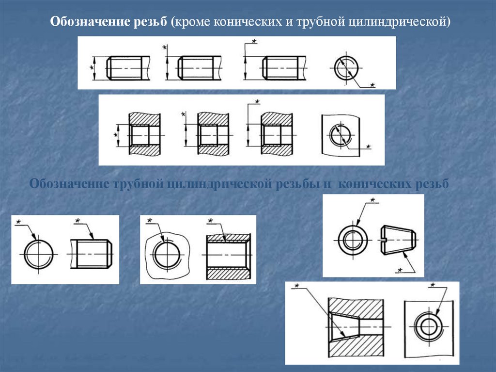 Обозначение резьб (кроме конических и трубной цилиндрической)Обозначение трубной цилиндрической резьбы и конических резьб