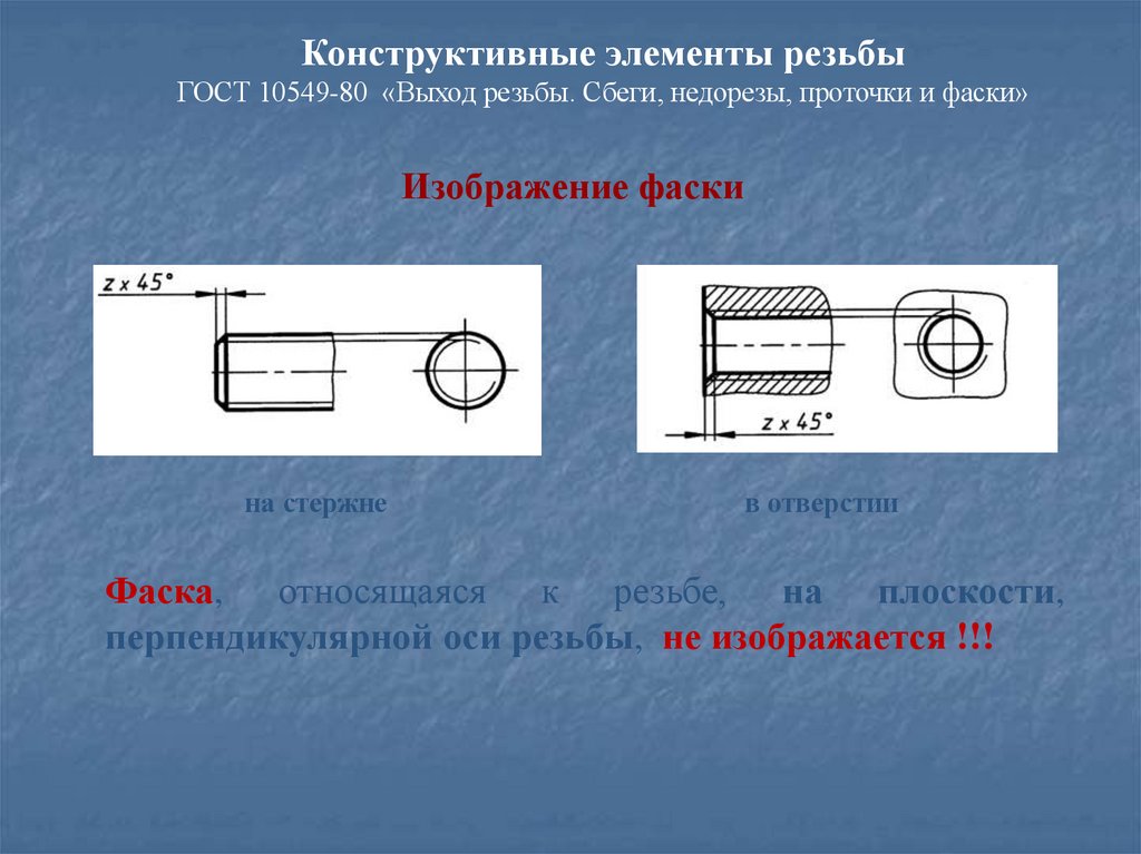 Конструктивные элементы резьбыГОСТ 10549-80 «Выход резьбы. Сбеги, недорезы, проточки и фаски»