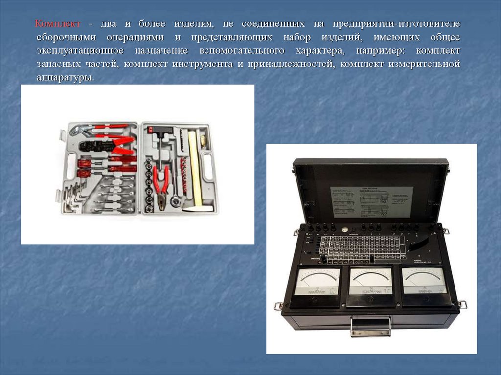 Комплект - два и более изделия, не соединенных на предприятии-изготовителесборочными операциями и представляющих набор изделий, имеющих общее