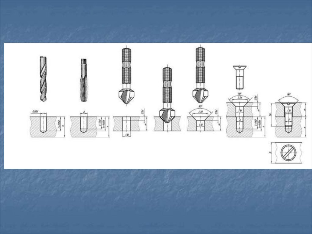 параллельной оси резьбы, в отверстии показывают только часть резьбы,