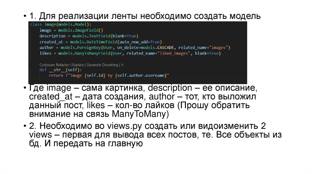• 1. Для реализации ленты необходимо создать модель• Где image – сама картинка, description – ее описание,