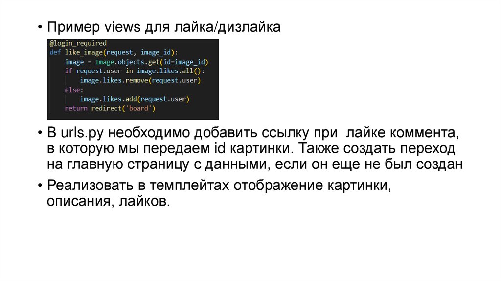 • Пример views для лайка/дизлайка• В urls.py необходимо добавить ссылку при лайке коммента,