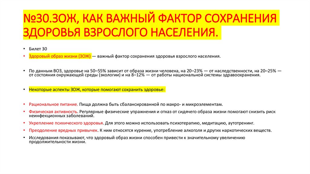 • Здоровый образ жизни (ЗОЖ) — важный фактор сохранения здоровья взрослого населения.