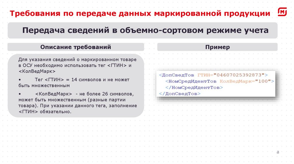 Требования по передаче данных маркированной продукцииПередача сведений в объемно-сортовом режиме учета