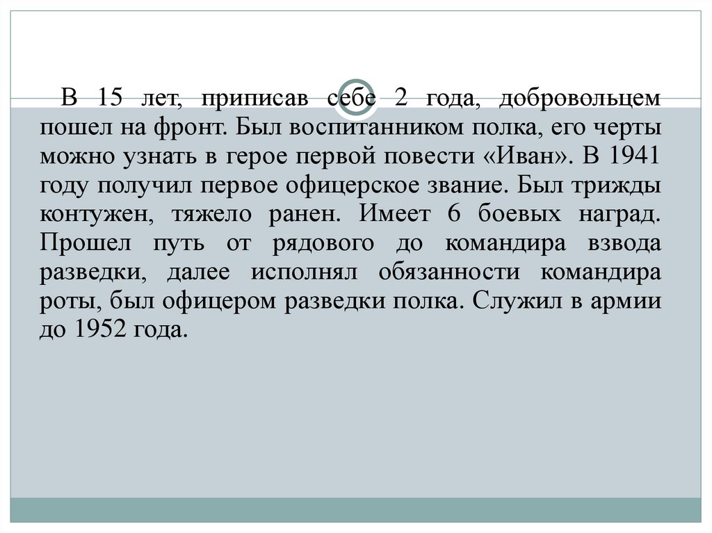 В 15 лет, приписав себе 2 года, добровольцемпошел на фронт. Был воспитанником полка, его черты