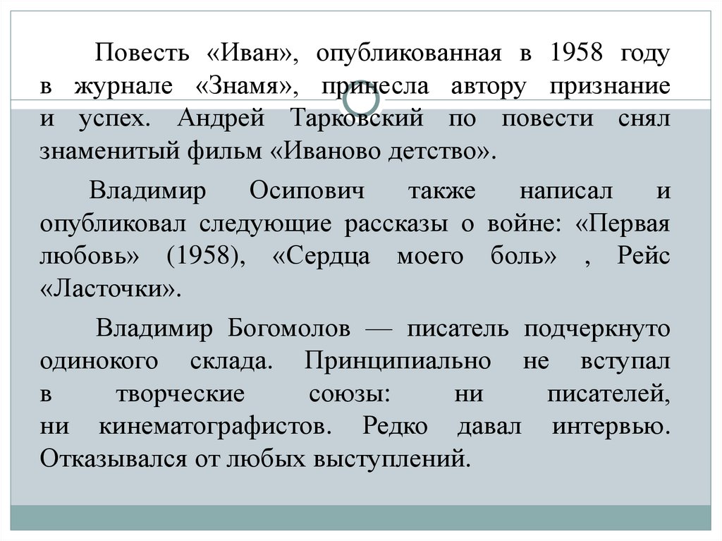 Повесть «Иван», опубликованная в 1958 годув журнале «Знамя», принесла автору признание